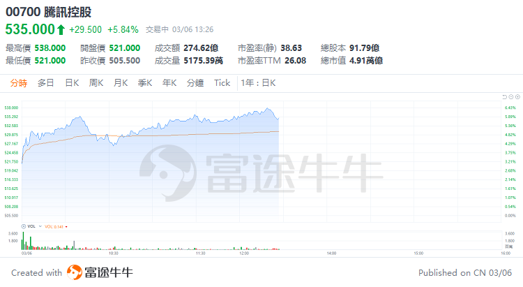 $腾讯控股 (00700.HK)$ 股价一度冲高至538港元,创下自2021年7月以来的新高。截至发稿,涨5.84%,报535港元;总市值为4.91万亿港元,逼近5万亿港元,较上个交易日增加近3千亿港元。
