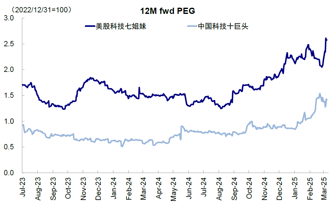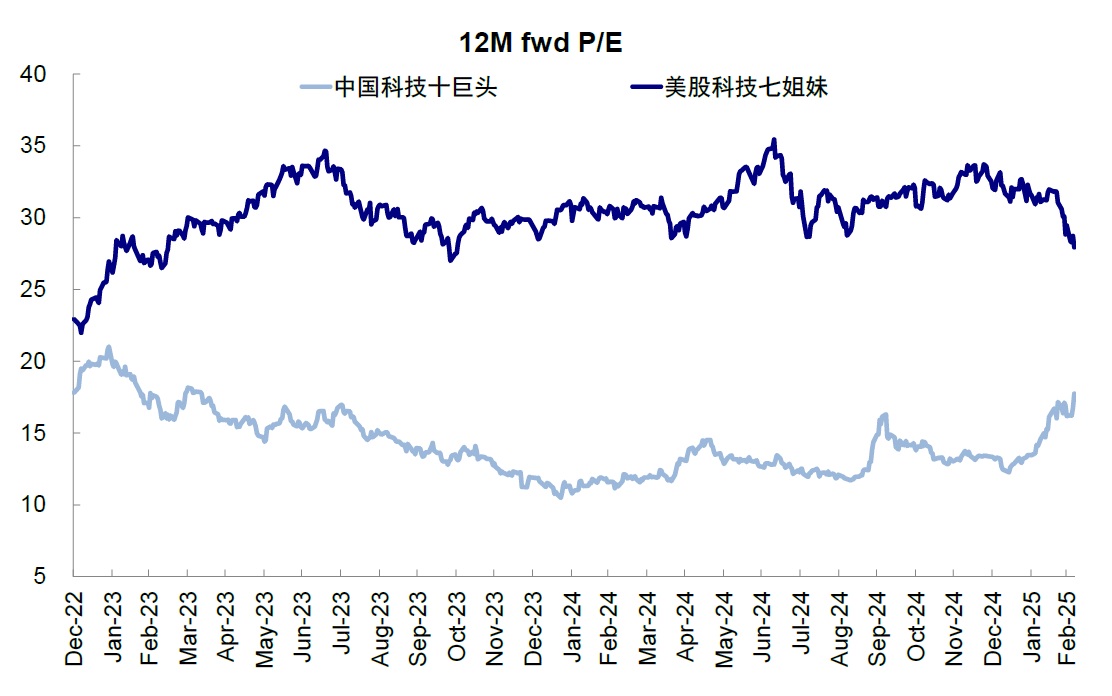 个股层面,可比公司口径下,港股标的估值低于美股等主要市场,中国“科技十巨头”动态PE均值为21.9x,低于美国“科技七姐妹”的28.4x。