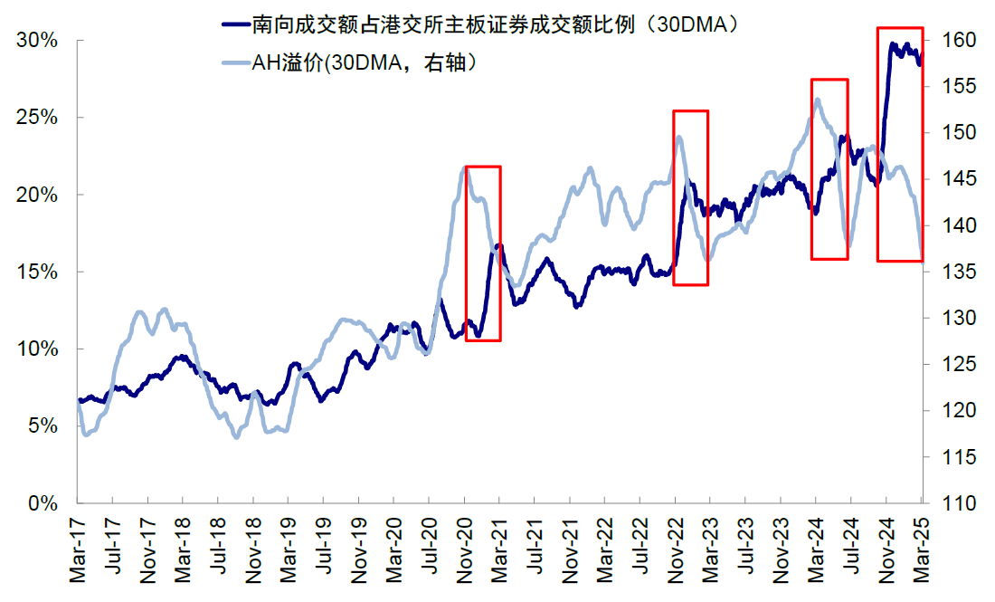南向资金加速流入,对港股定价影响力上升。港股作为离岸市场,估值是国内外投资者共同的观点表达,FactSet自下而上汇总MSCI中国前100权重股可拆解部分中外资占比超过65%,外国投资者基于“国家溢价”通常要求更高的风险补偿,长期压制港股估值。近期南向资金大幅流入,年初以来累计买入3,139亿港币,为去年同期的5倍以上,南向成交占比维持在30%左右,回顾历次南向成交占比抬升,均对应AH溢价阶段性回落,内地投资者在港股市场的活跃程度影响港股资产价格重估。