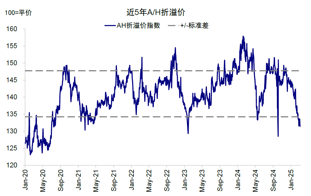 从这个意义上,当同一公司在A股和港股扣20%税后股息率相等,即AH溢价收敛至125%时,分红对南向投资者的吸引力将大打折扣,对应红利板块相对A股的空间为5%。