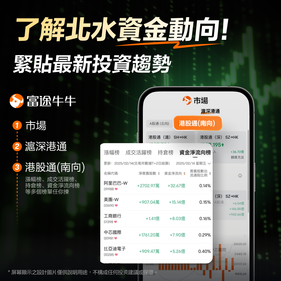 了解北水资金动向,紧贴最新投资趋势!市场>沪深港通>港股通(南向),仲有涨幅榜、成交活跃榜、持仓榜、资金净流向榜等多个榜单任你拣。