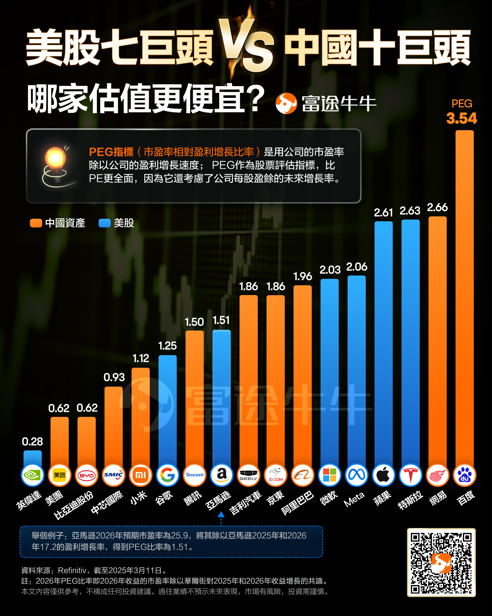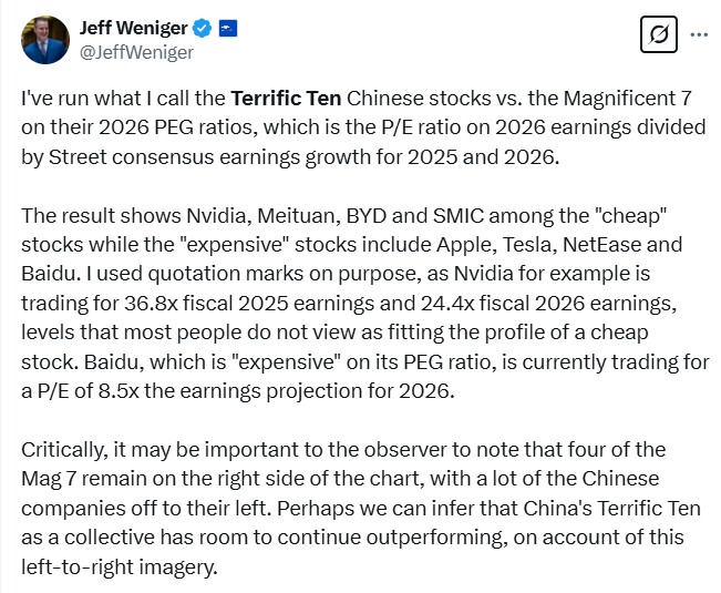 3月11日,Jeff Weniger又将美股七巨头和中国十巨头放在一起比较了PEG(比较了它们的2026年PEG比率,即2026年收益的市盈率除以华尔街对2025年和2026年收益增长的共识):