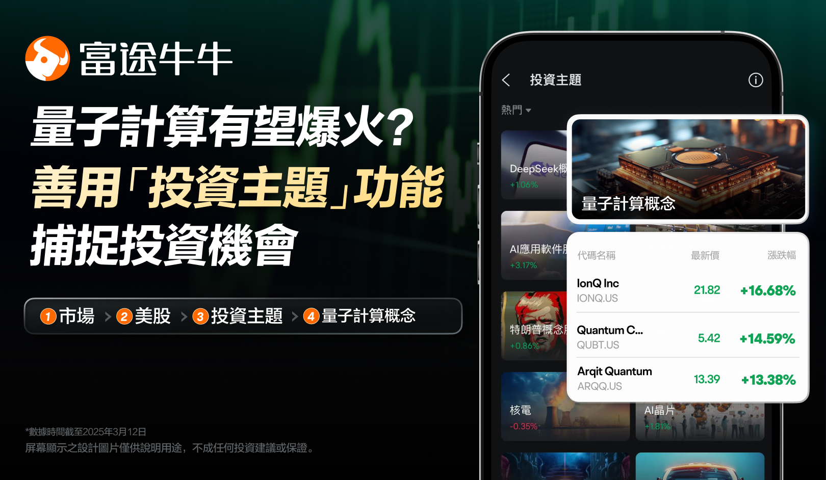 量子计算有望爆火?善用「投资主题」功能,打开富途牛牛>美股>投资主题>量子计算概念,捕捉投资机会!