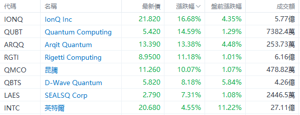 受此消息刺激,量子计算概念股集体走强, $IonQ Inc (IONQ.US)$ 大涨近17% $Quantum Computing (QUBT.US)$ 涨超14%, $Arqit Quantum (ARQQ.US)$ 涨超13%, $Rigetti Computing (RGTI.US)$ 涨超11% ,$昆腾 (QMCO.US)$ 涨超10%, $D-Wave Quantum (QBTS.US)$ 涨超8%。截至发稿,相关概念股盘前继续走强。
