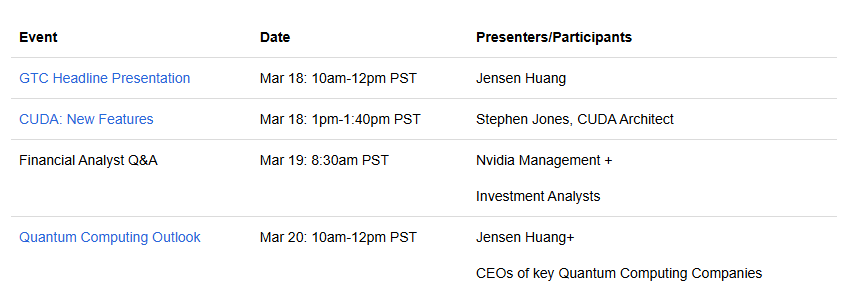 此外,GTC大会目录显示英伟达还将举办一个活动宣布CUDA的更新。这是该公司专有的GPU编程语言,作为英伟达的核心软件竞争力,预计投资者也将期待这场活动的内容。