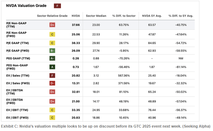 尽管其GAAP估值倍数已经达到26倍,但该估值也比英伟达的五年平均水平低约58%。