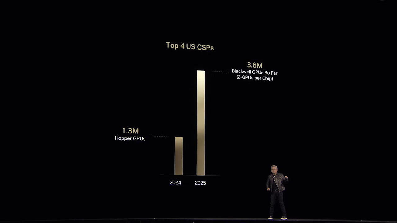 他透露,2024年,美国前四大云服务提供商(CSP)、所谓超大规模云服务商(hyperscaler)购买了130万块英伟达的Hopper架构芯片,2025年,又购买了360万Blackwell架构芯片。