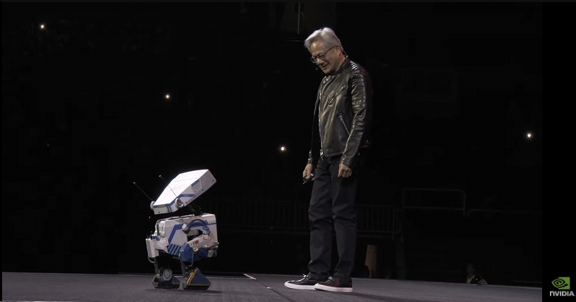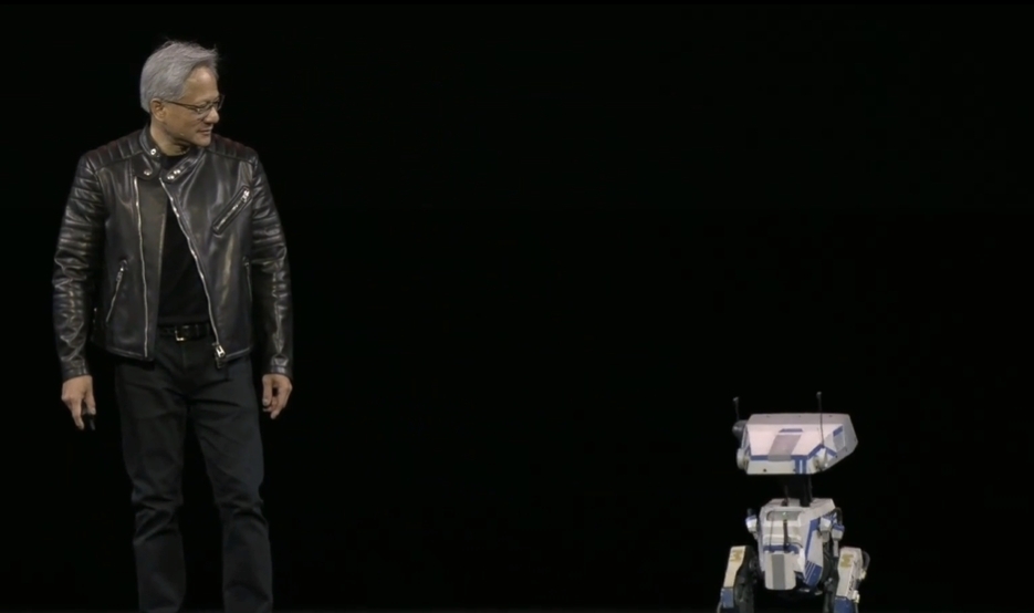 英伟达先展示了一段演示动画,然后一个真的机器人出现在舞台上,开始向黄仁勋走去。这个机器人像《星球大战》中的机器人一样移动,发出可爱的声音,行走动作自然。黄仁勋把这个机器人叫做Blue,该机器人配有英伟达最新的GR00T N1机器人通用基础模型。