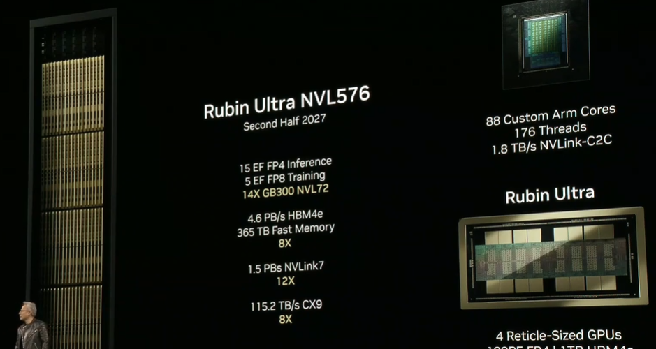 不仅如此,英伟达还宣布了Vera Rubin之后的一代芯片,名为Vera Rubin Ultra。将于2027年下半年上市的Vera Rubin Ultra将把Vera CPU和Rubin Ultra芯片结合在一起。每个Rubin处理器由两个GPU组成一个单芯片,而Rubin Ultra则由四个GPU组成。