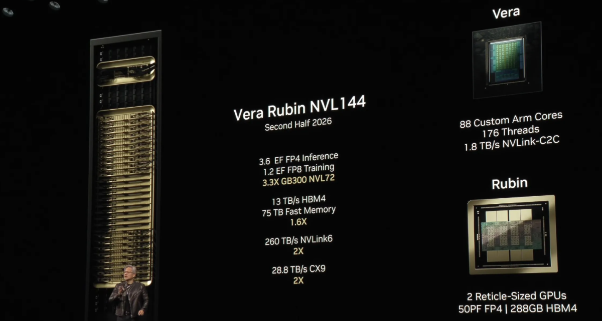 Vera Rubin NVL144系统能够进行3.6 EF的FP4推理,1.2 EF的FP8训练,性能约为GB300 NVL72的3.3倍。