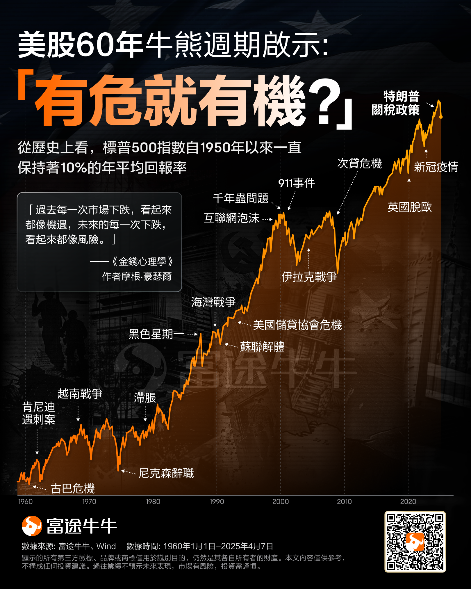回顾历史,自1950年以来,尽管经历了黑色星期一、互联网泡沫、911恐怖袭击、金融危机和新冠疫情等重大事件,标普500指数的整体走势仍是向上的,年均回报率在10%左右。