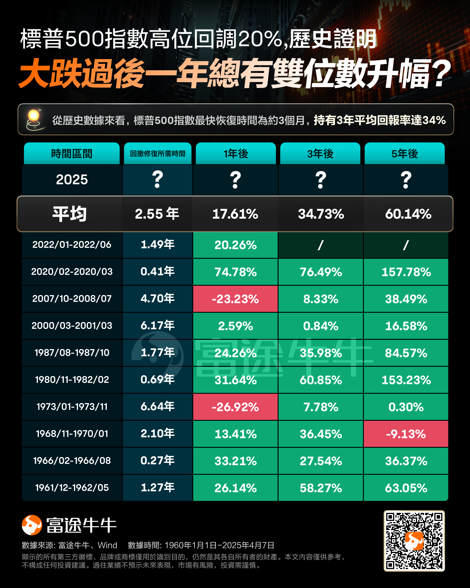 此外,回顾过去60年, $标普500指数 (.SPX.US)$ 曾经历过10次20%以上的回撤,但该指数最快3个月就修复了,且若持有3年平均回报率高达34%。