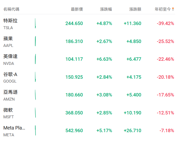 在本轮关税政策冲击下,美股七巨头中, $特斯拉 (TSLA.US)$ 年内跌幅高达40%, $苹果 (AAPL.US)$ 、 $英伟达 (NVDA.US)$ 、 $谷歌-A (GOOGL.US)$ 跌超20%, $亚马逊 (AMZN.US)$ 跌超17%, $微软 (MSFT.US)$跌超12%, $Meta Platforms (META.US)$ 跌超7%。