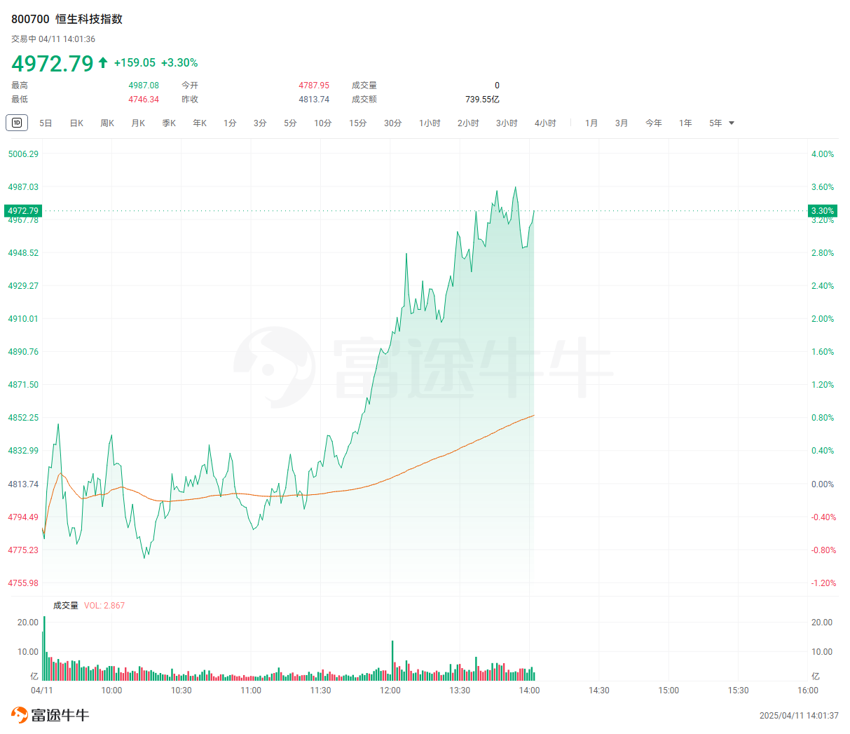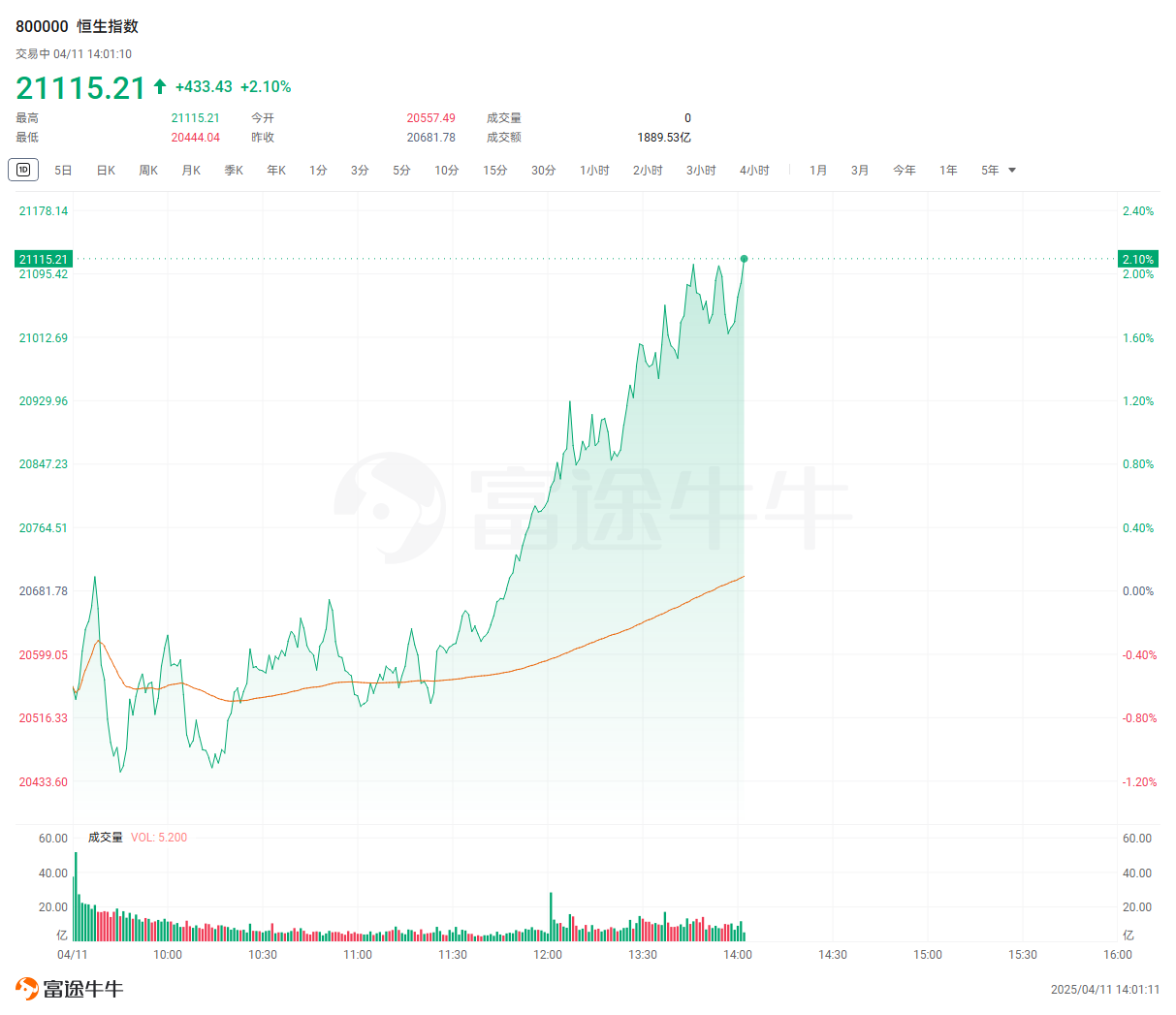 富途资讯消息,截至2025年4月11日 14:01, $恒生指数 (800000.HK)$ 经历了一些盘整后迅速反弹,上行突破21100点,其中芯片、互联网板块涨幅居前。