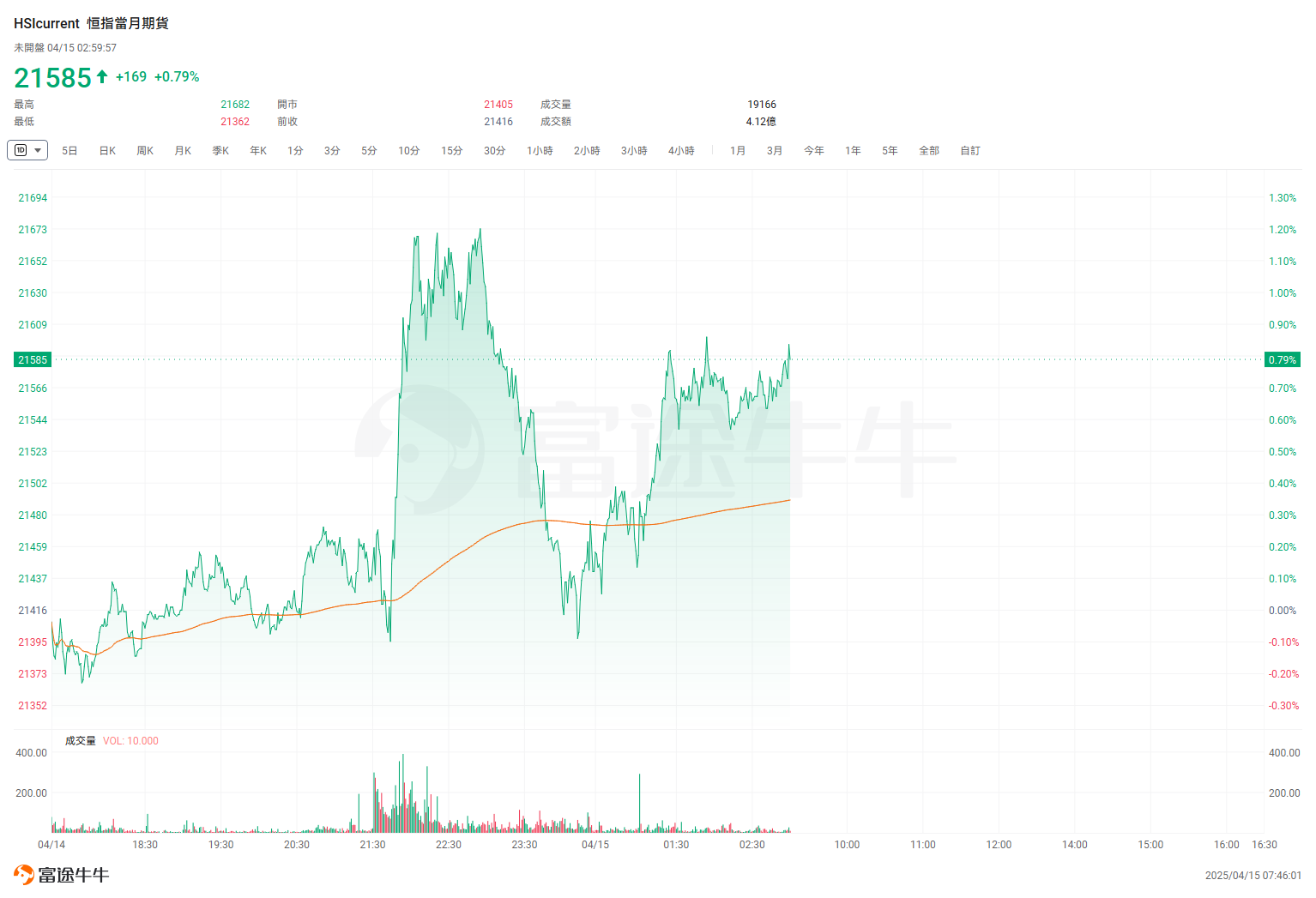 周一,港股三大指数集体走强,$恒生科技指数 (800700.HK)$涨2.34%,$恒生指数 (800000.HK)$涨2.4%,收报21417.4点,盘中高见21517.32点,低见21224.55点。夜晚$恒指当月期货 (HSIcurrent.HK)$ 收报21585点,上涨169点或0.79%,高水168点。
