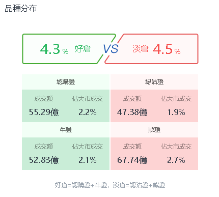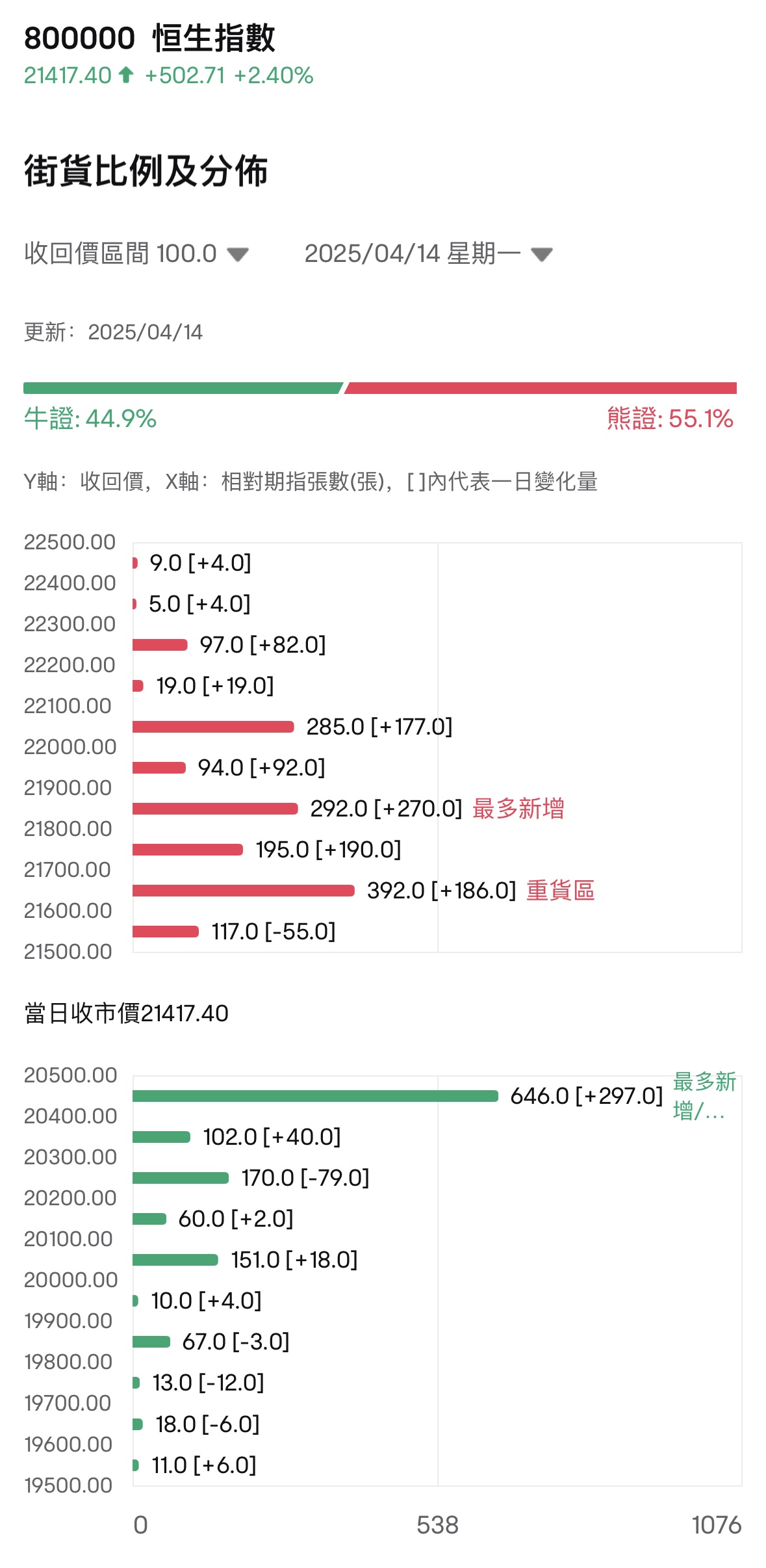 截至4月14日,恒指最新的牛熊街货比例为44.9:55.4。