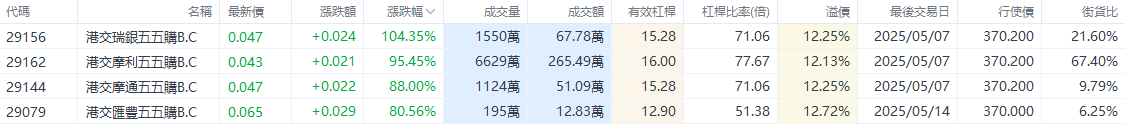 $香港交易所 (00388.HK)$ 昨日涨近7%,认购证$港交瑞银五五购B.C (29156.HK)$ 大赚逾一倍。