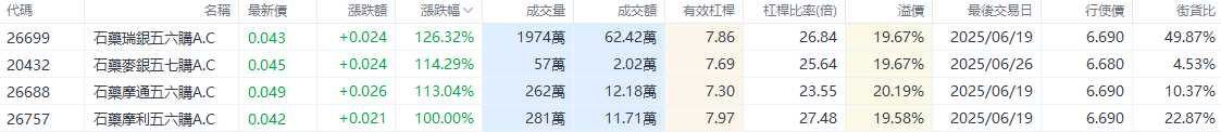 $石药集团 (01093.HK)$昨日大涨逾9%,多张认购证大赚, $石药瑞银五六购A.C (26699.HK)$ 、 $石药麦银五七购A.C (20432.HK)$ 、 $石药摩通五六购A.C (26688.HK)$ 均大赚逾一倍。