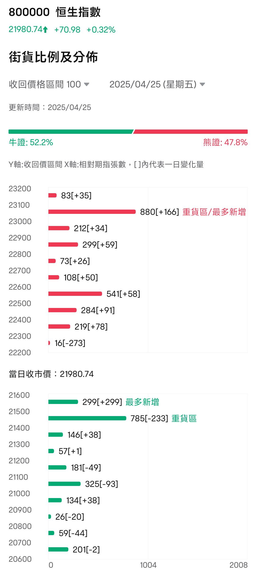 牛熊证街货分布图中的数据显示,熊证街货重货区和最多新增都在23000-23099区间,该区间最新熊证数量为880张,较上一交易日增加166张。