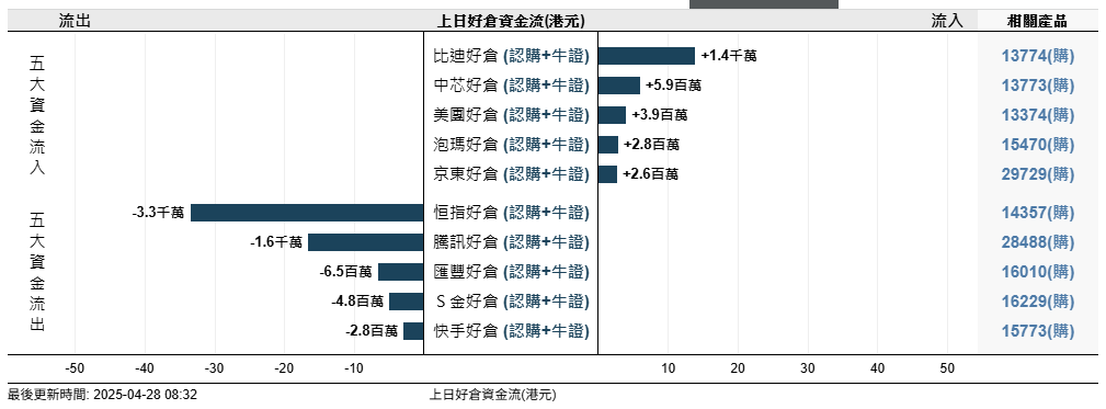 好仓资金流入前正股分别是: $比亚迪股份 (01211.HK)$ 、 $中芯国际 (00981.HK)$ 、 $美团-W (03690.HK)$ 、 $泡泡玛特 (09992.HK)$ 、 $京东集团-SW (09618.HK)$ 。
