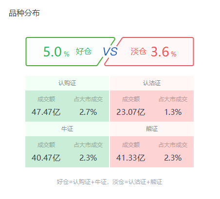截至昨日收市,大市成交1176.58亿港元,所有窝轮牛熊证合计成交152.34亿港元,占大市成交8.6%,其中好仓占比5%,淡仓占比3.6%。所有轮证资金净流出5.28亿港元。