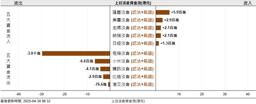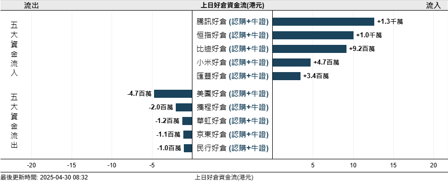 轮证资金流方面,港交好仓前日录得约279万港元净流入,至于淡仓前日录70万港元净流出。部署业绩可留意港交购 $港交摩通五八购C.C (15623.HK)$ /沽 $港交摩通五八沽A.P (13595.HK)$ 。
