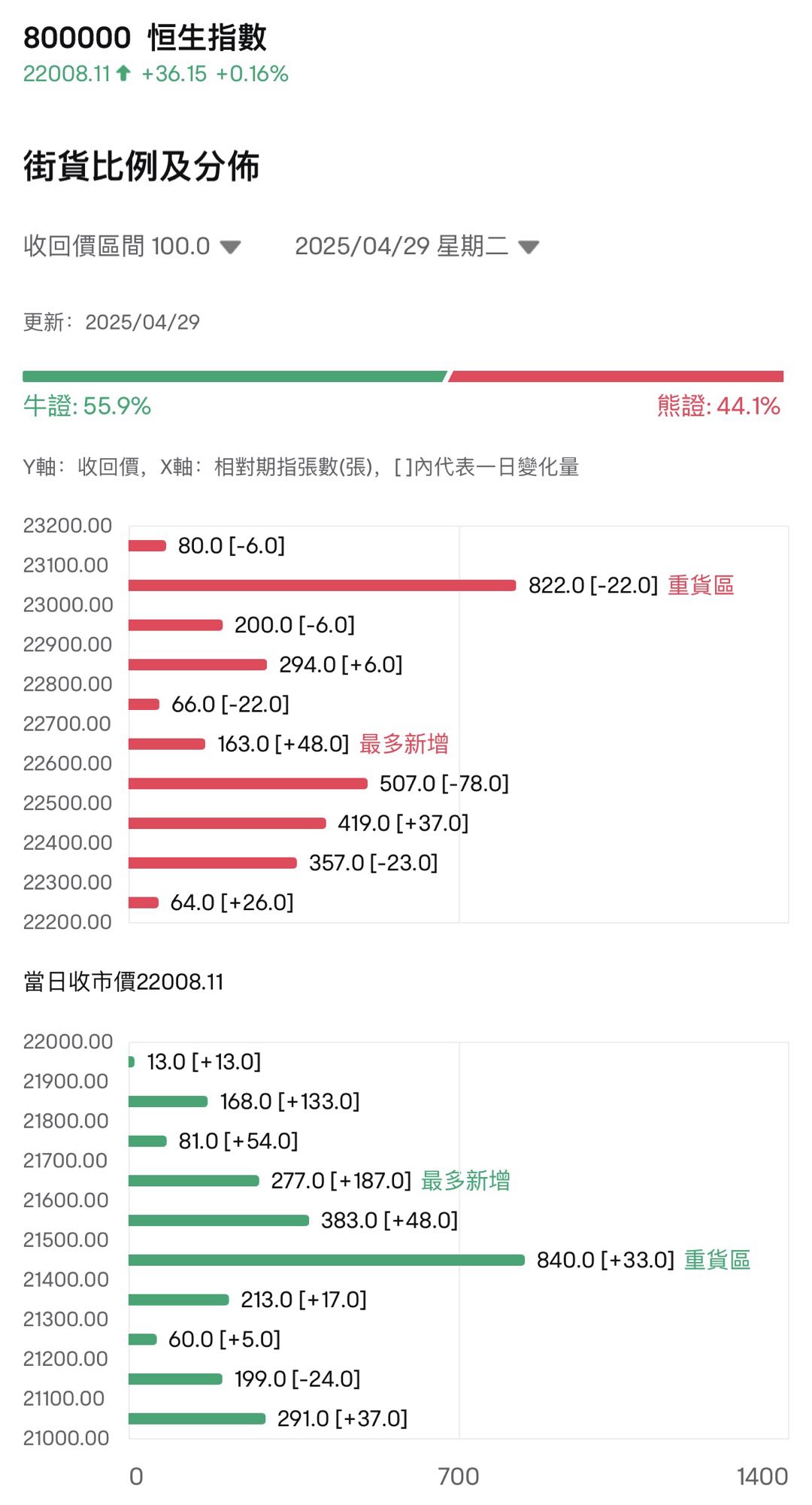截至4月29日,恒指最新的牛熊街货比例为56:44。