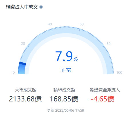 截至昨日收市,大市成交2133.68亿港元,所有窝轮牛熊证合计成交168.85亿港元,占大市成交7.9%,其中好仓占比4.6%,淡仓占比3.3%。所有轮证资金净流出4.65亿港元。