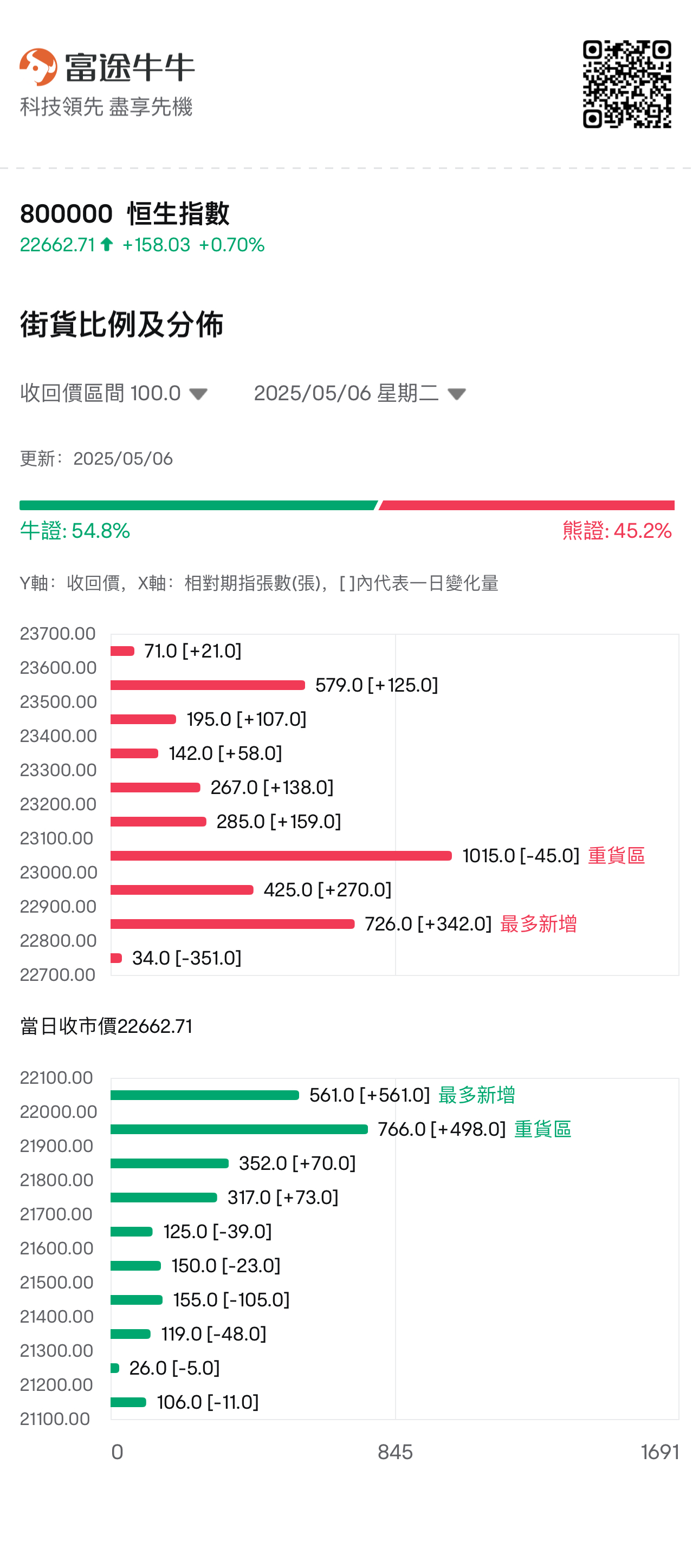 牛熊证街货分布图中的数据显示,熊证街货重货区在23000-23099区间,该区间最新熊证数量为1015张,较上一交易日减少45张;最多新增区在22800-22899区间,该区间最新熊证数量为726张,较上一交易日增加342张。