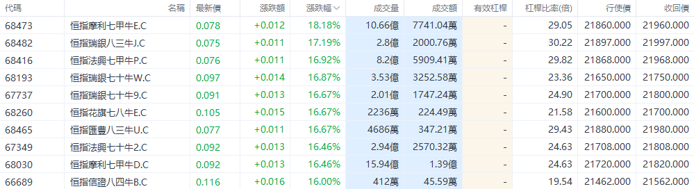 昨日港股表现相对平淡,三大指数走势分化,恒指上涨0.7%,多张牛证升近20%,其中收回价为21960的 $恒指摩利七甲牛E.C (68473.HK)$ 涨逾18%,收回价为21997的 $恒指瑞银八三牛J.C (68482.HK)$ 涨逾17%。