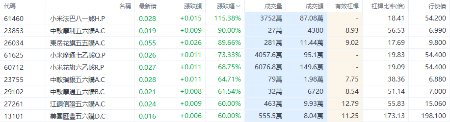 个股方面, $小米集团-W (01810.HK)$ 昨日回调近3%,一熊证 $小米法巴八一熊H.P (61460.HK)$ 飙升逾115%;华为概念股 $中国软件国际 (00354.HK)$ 昨日大涨超7%,一认购证 $中软摩利五六购A.C (23853.HK)$ 大涨90%。