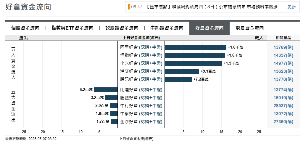 好仓资金流入前五指数与正股分别是: $阿里巴巴-W (09988.HK)$ 、 $恒生指数 (800000.HK)$ 、 $小米集团-W (01810.HK)$ 、 $香港交易所 (00388.HK)$ 、 $腾讯控股 (00700.HK)$ 。