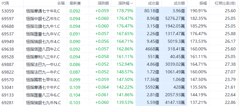 周一中美联合声明发布后,恒指午后直线拉升,收涨近3%。 $恒指摩通七十牛R.C (53059.HK)$、 $恒指中银七乙牛9.C (69597.HK)$、 $恒指花旗七九牛1.C (69688.HK)$ 多张牛证爆赚超180%。