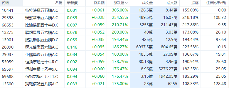 个股方面,港股汽车、苹果概念股表现亮眼, $比亚迪股份 (01211.HK)$ 涨超7%,一牛证涨超210%; $舜宇光学科技 (02382.HK)$ 涨近15%,多张认购证上涨; $瑞声科技 (02018.HK)$ 涨超15%, 认购证$瑞声信证五八购A.C (13500.HK)$涨175%。