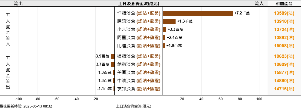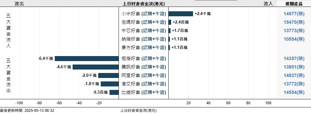 好仓资金流入前五正股分别是: $小米集团-W (01810.HK)$ 、 $泡泡玛特 (09992.HK)$、 $中芯国际 (00981.HK)$、 $纳斯达克综合指数 (.IXIC.US)$、 $康方生物 (09926.HK)$ ;