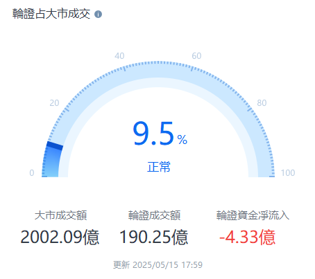 截至昨日收市,大市成交2002.09亿港元,所有窝轮牛熊证合计成交190.25亿港元,占大市成交9.5%,其中好仓占比6%,淡仓占比3.5%。所有轮证资金净流出4.33亿港元。
