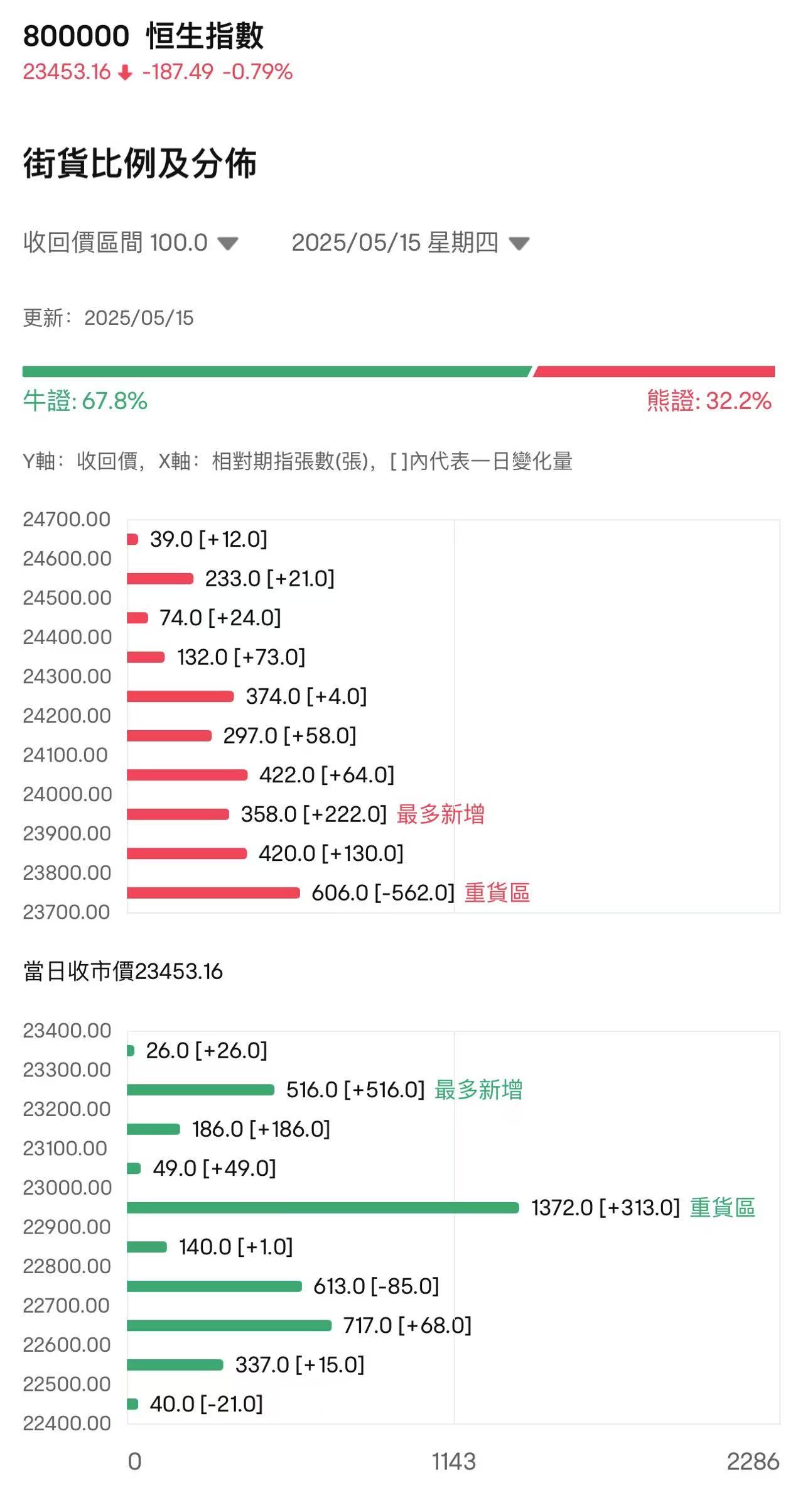 截至5月15日,恒指最新的牛熊街货比例为67.8:32.2。