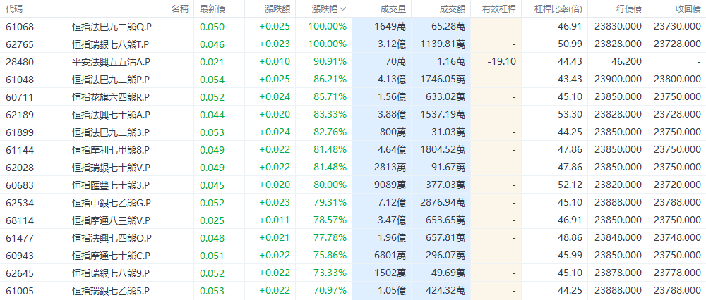 昨日港市低迷,恒指跌0.79%,多张熊证升超70%,其中收回价为23730的 $恒指法巴九二熊Q.P (61068.HK)$ 以及收回价为23728的 $恒指瑞银七八熊T.P (62765.HK)$ 翻倍大赚。