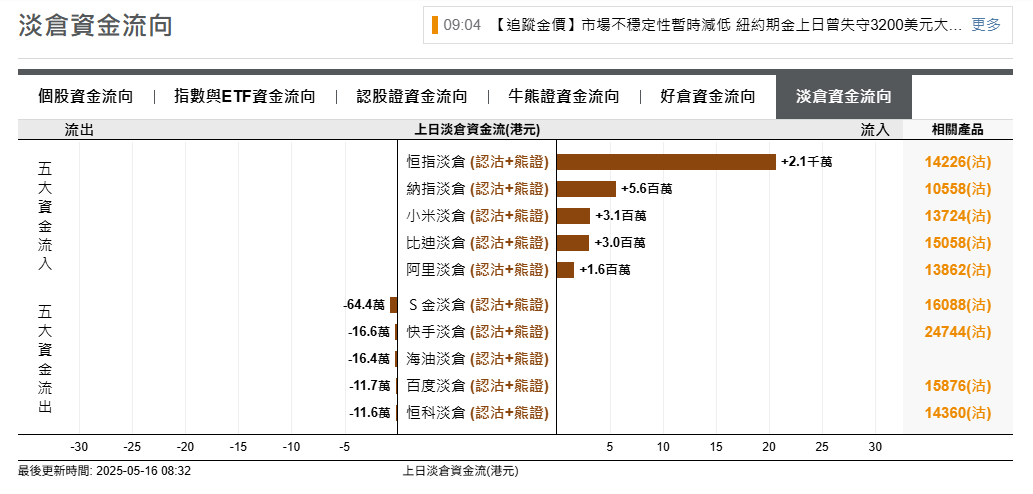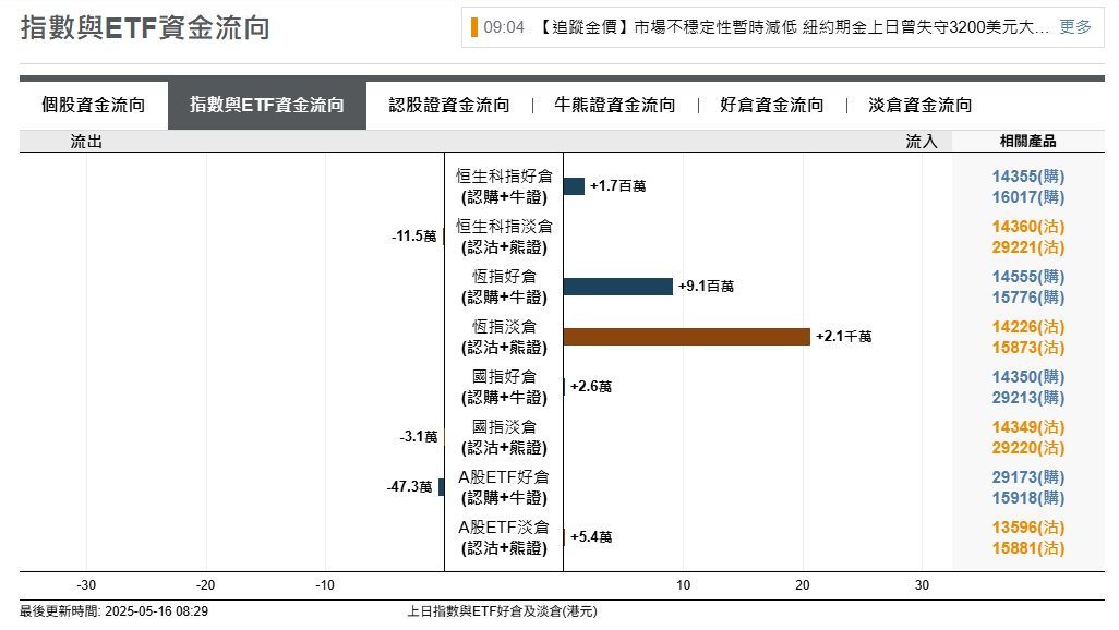 恒生指数资金流向方面,好仓净流入910万港元,淡仓净流入2100万港元。