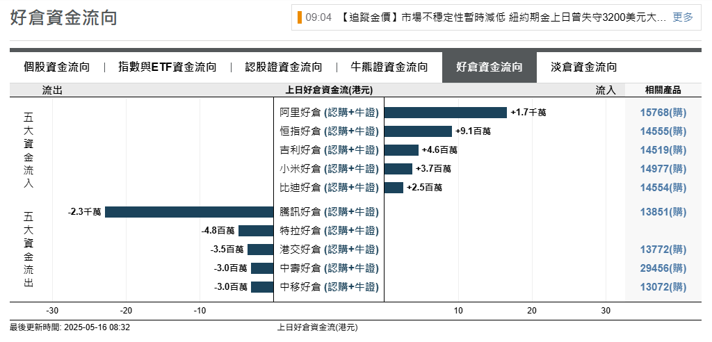 好仓资金流入前五指数与正股分别是: $阿里巴巴-W (09988.HK)$ 、 $恒生指数 (800000.HK)$、 $吉利汽车 (00175.HK)$ 、 $小米集团-W (01810.HK)$ 、 $比亚迪股份 (01211.HK)$ 。