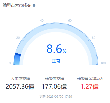 截至昨日收市,大市成交2057.36亿港元,所有窝轮牛熊证合计成交177.06亿港元,占大市成交8.6%,其中好仓占比4.8%,淡仓占比3.8%。所有轮证资金净流出1.27亿港元。