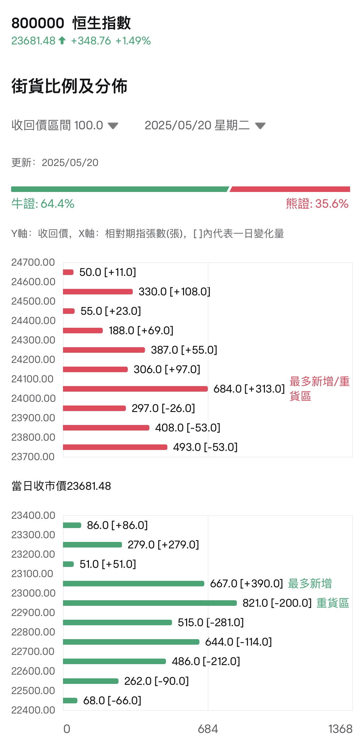 截至5月21日,恒指最新的牛熊街货比例为64.4:35.6。