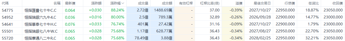 周二,恒生指数震荡上行,收涨1.49%,多张牛证大涨,其中 $恒指汇丰七十牛C.C (54775.HK)$、 $恒指瑞银六九牛4.C (54952.HK)$ 大赚约八成。