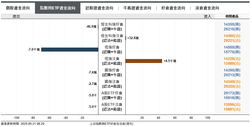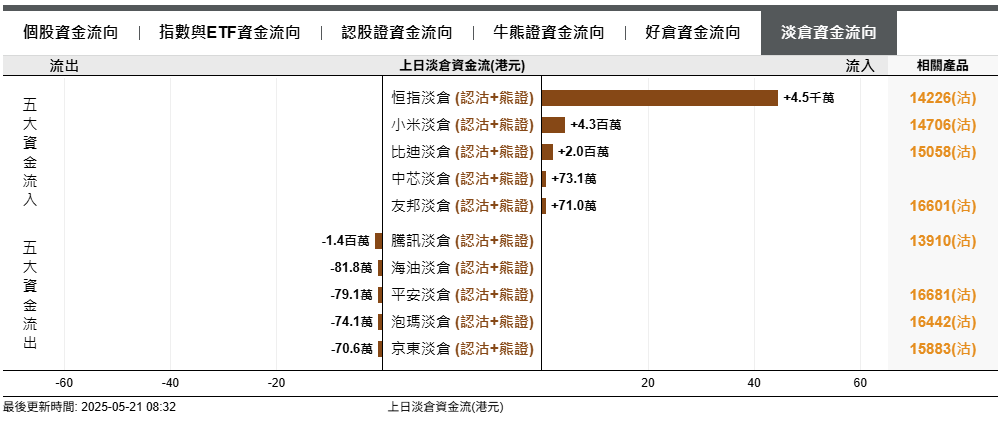 恒生指数资金流向方面,好仓净流出7000万港元,淡仓净流入4500万港元。