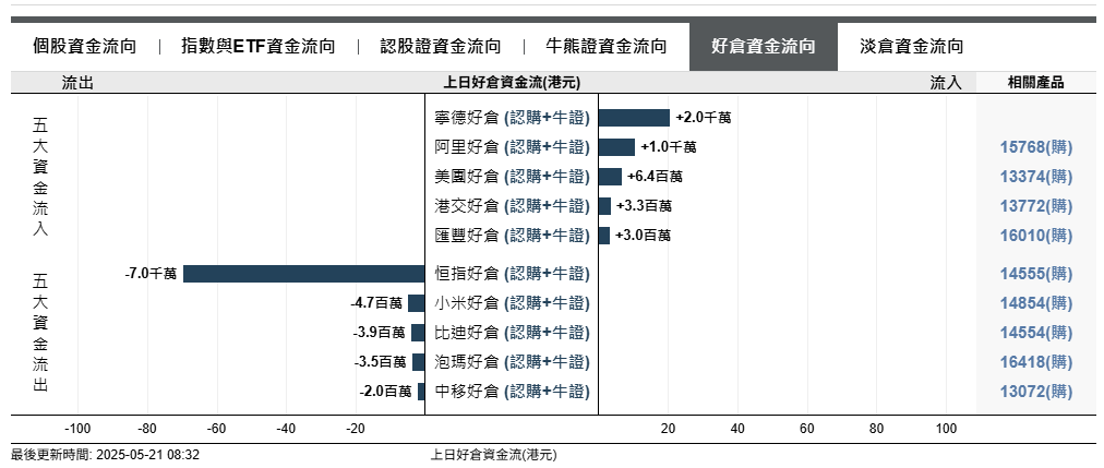 好仓资金流出前五指数与正股分别是: $恒生指数 (800000.HK)$、 $小米集团-W (01810.HK)$、 $比亚迪股份 (01211.HK)$、 $泡泡玛特 (09992.HK)$、 $中国移动 (00941.HK)$ 。