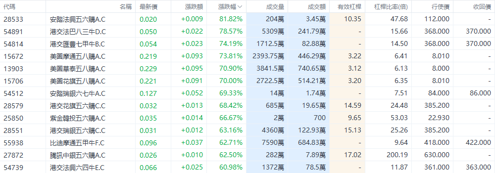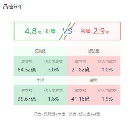 昨日认购证成交64.52亿港元,认沽证成交21.82亿港元;牛证成交39.67亿港元,熊证成交41.16亿港元。