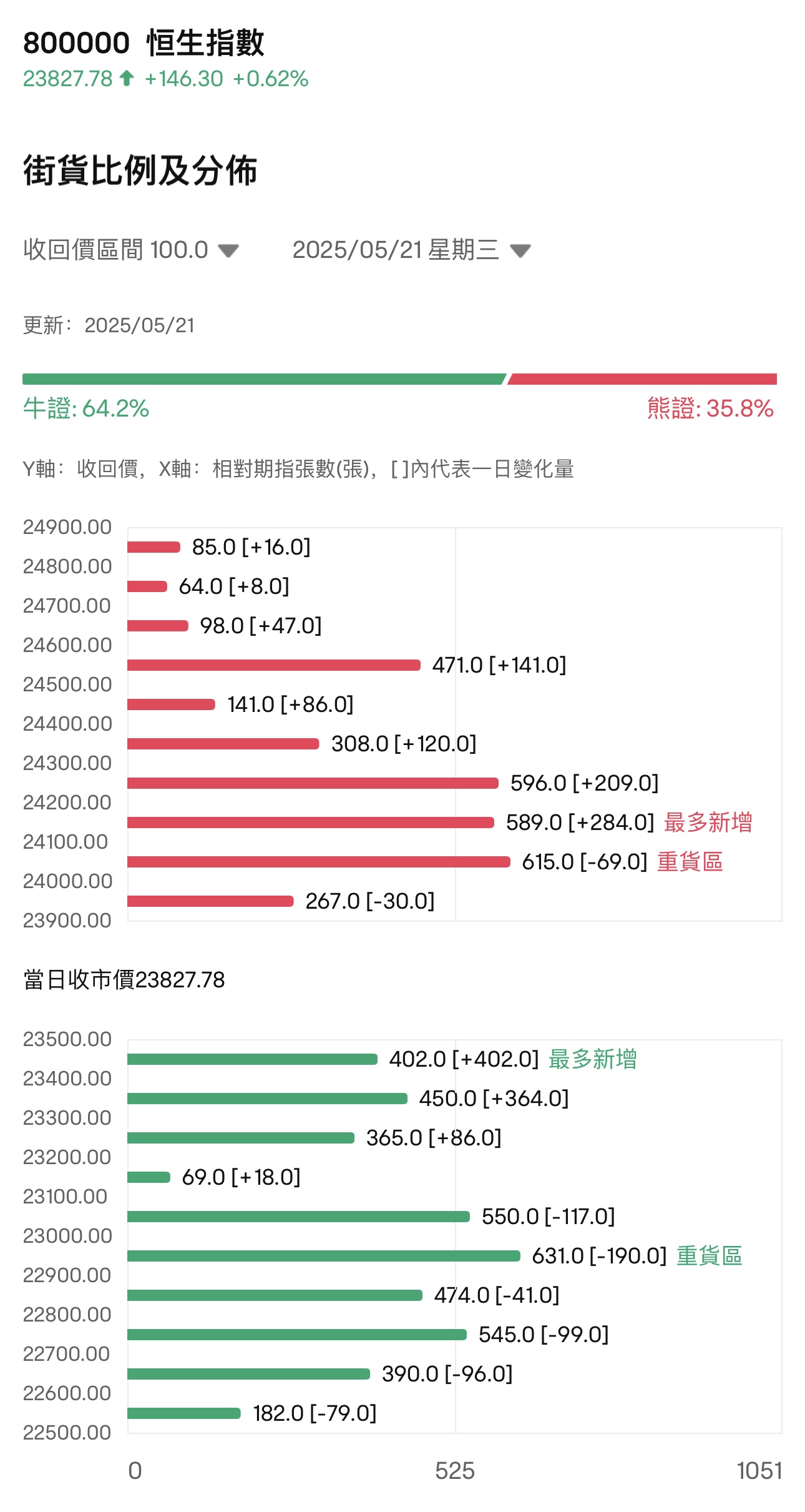 截至5月21日,恒指最新的牛熊街货比例为64.2:35.8。