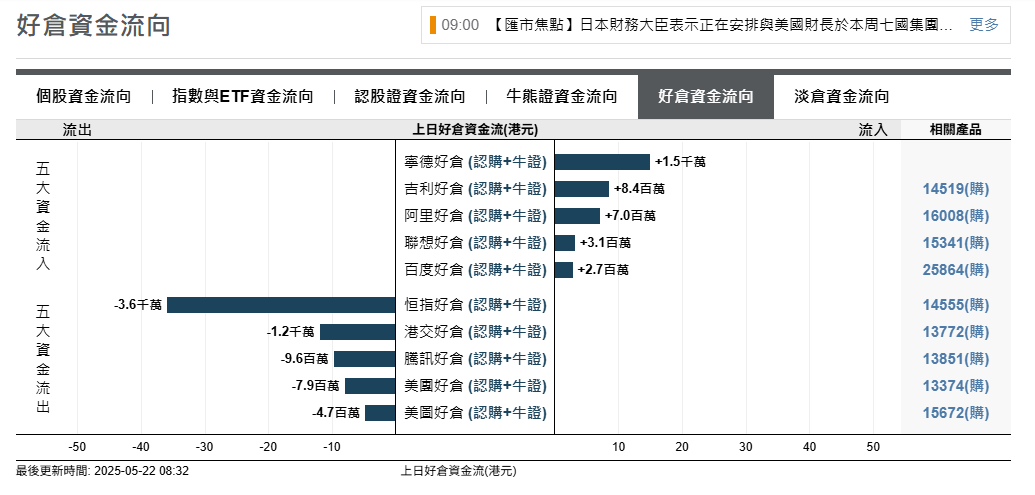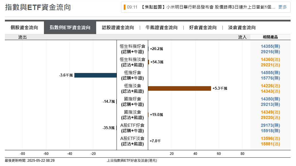恒生指数资金流向方面,好仓净流出3600万港元,淡仓净流入5300万港元。