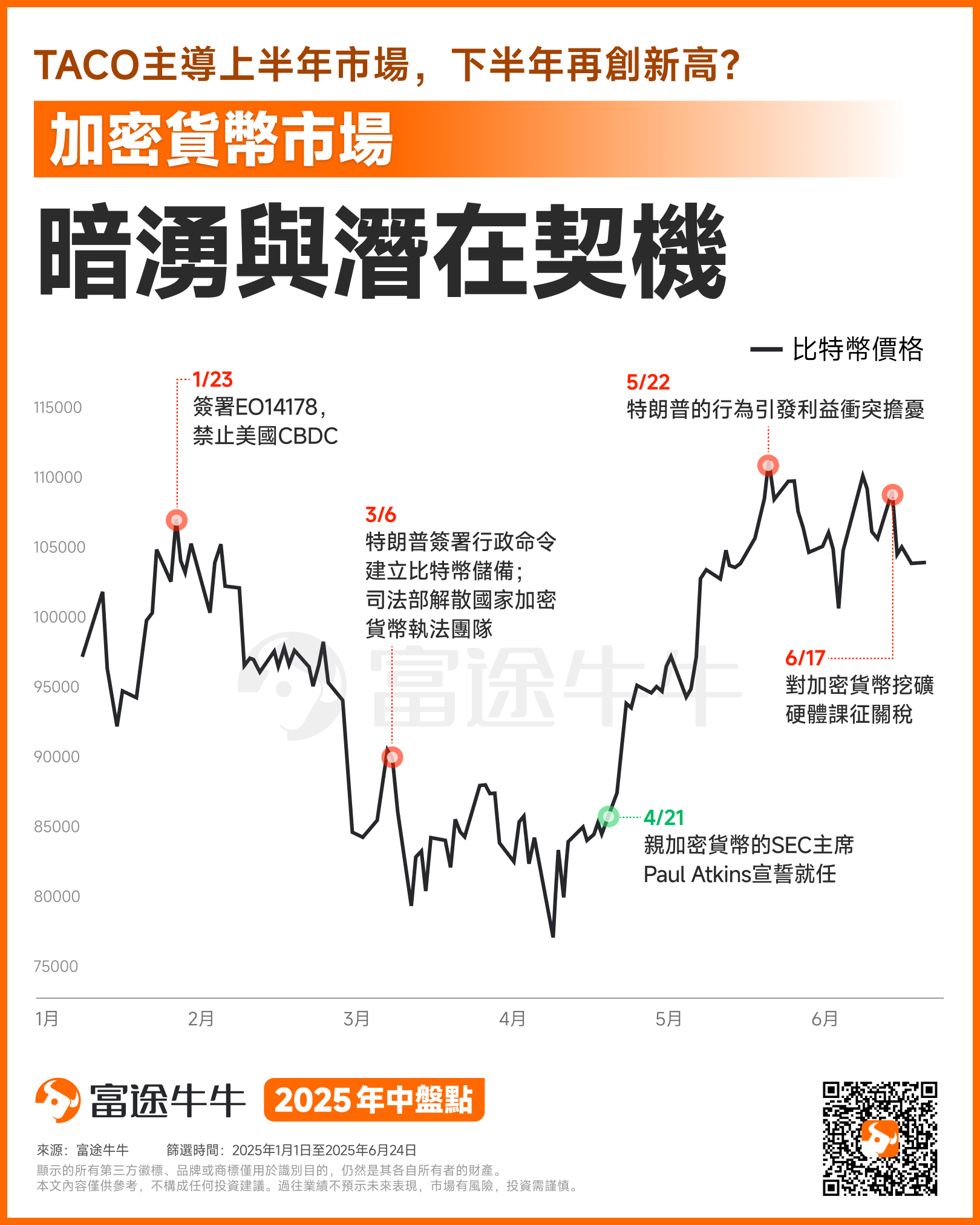 5月27日,特朗普媒体与技术集团宣布将比特币纳入资产负债表,并支持加密货币ETF推出,进一步提振看涨情绪;6月17日,进口矿机关税引发美国矿工担忧,但比特币仍保持韧性。