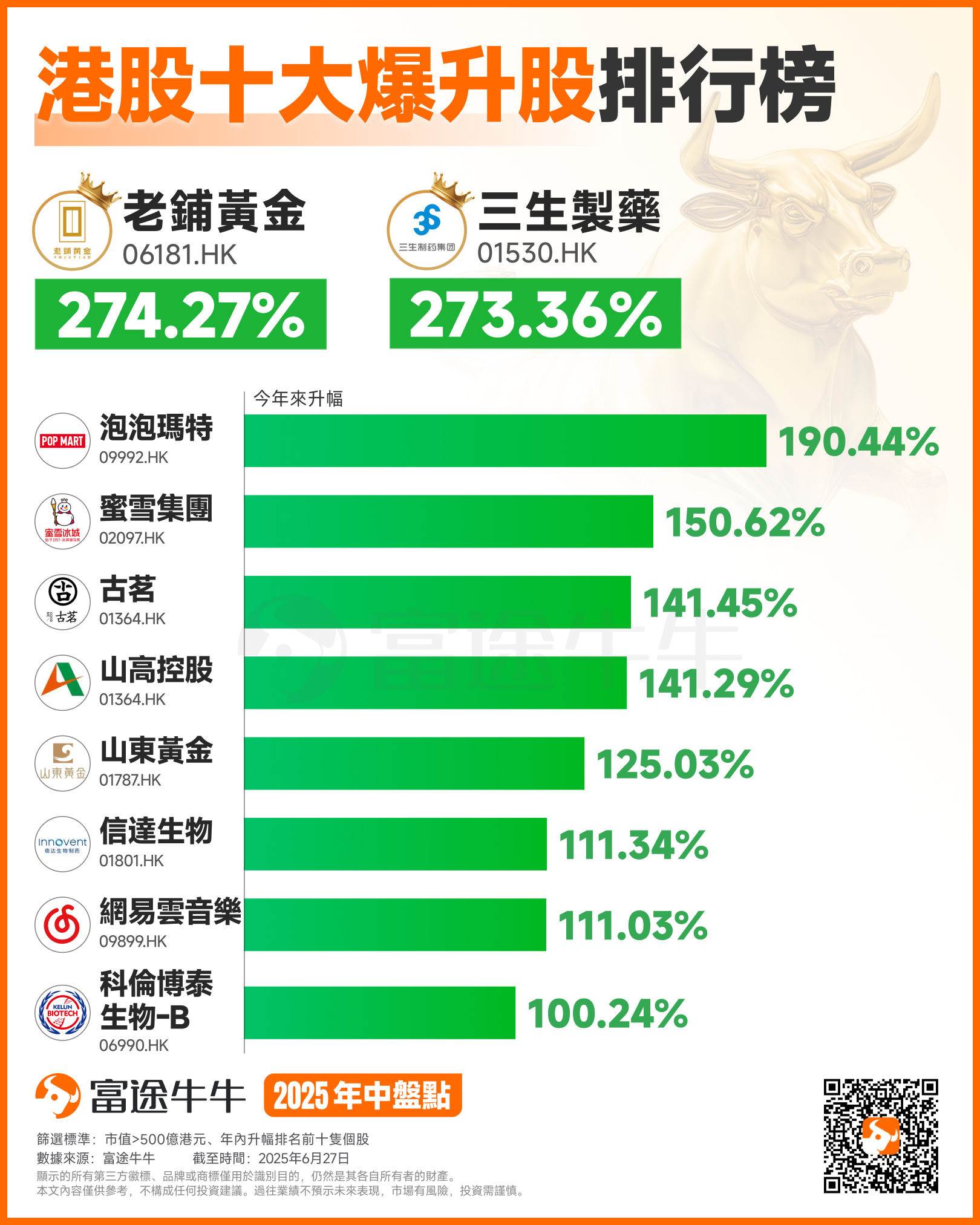 今年上半年,整个港股市场营造出牛市氛围,其中也涌现出大量牛股。统计显示,截至6月27日收盘,港股主板个股中,共有141只个股年内涨幅超过100%。